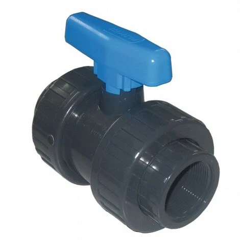 - 3-teiliger PVC Kugelhahn mit Anschlussmöglichkeiten in den Größen 1 1/2″ Innengewinde, so wie Ø50 mm